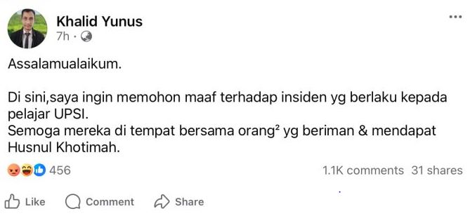 Bagaimanapun, tinjauan MalaysiaGazette mendapati status kontroversi itu telah dipadamkan dan Khalid memuat naik satu lagi status dengan permohonan maaf kepada ahli keluarga mangsa.