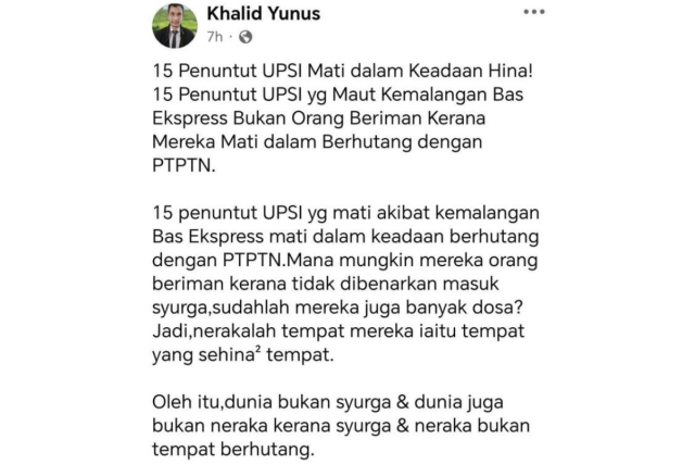 Sebelum itu tular di media sosial memaparkan status di Facebook milik guru itu, Khalid Yunus menyatakan kematian kesemua mangsa itu adalah sebagai dalam keadaan hina.