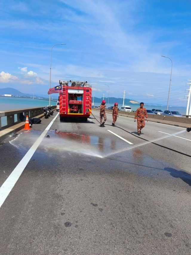 “Kita menerima panggilan pada jam 2.28 petang bagi bantuan mencuci jalan di lokasi kejadian dan seramai sembilan anggota dari Balai Bomba dan Penyelamat Perai dikerahkan bersama sebuah jentera FRT serta EMRS.