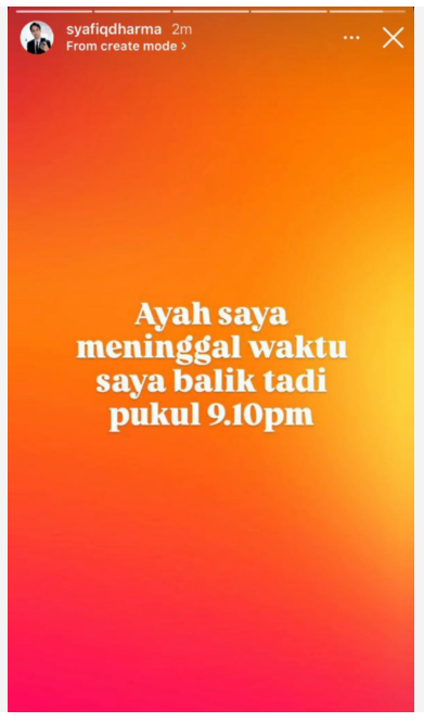 Kuala Lumpur: Anak kedua pelakon Dharma Harun Al Rashid iaitu Muhammad Al Syafiq, 36, memaklumkan bapanya meninggal dunia sendirian di rumah mereka, hari ini.