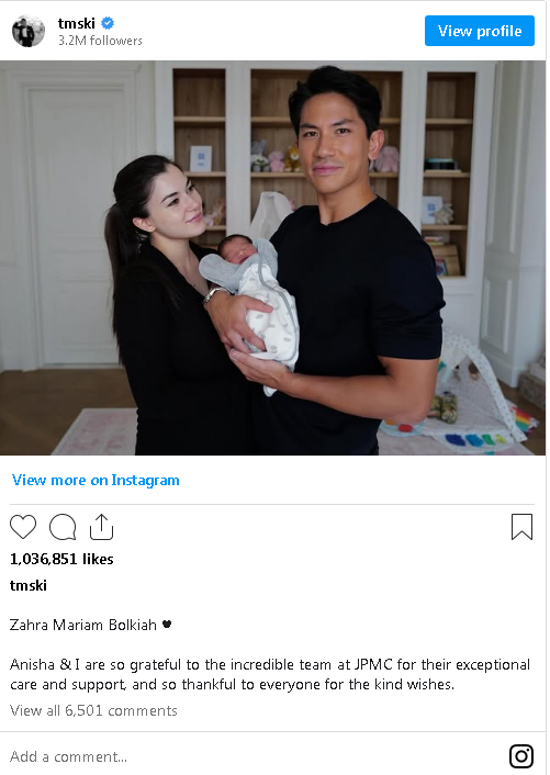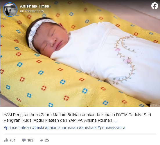 Menerusi muat naik di Instagram pada malam tadi, Putera Mateen berkongsi imej anakanda perempuan, Pengiran Anak Zahra Mariam Bolkiah yang mesra dipanggil ‘Princess Zahra’, dalam dakapan baginda. Hantaran tersebut pantas meraih perhatian ramai apabila mencatat lebih 500,000 tanda suka dalam tempoh singkat.