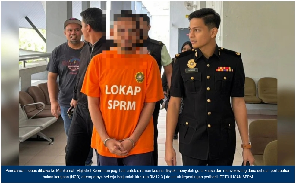 Perintah reman selama lima hari sehingga 26 April 2026 terhadap suspek dikeluarkan Majistret Sara Afiqah Zulkifli selepas permohonan dibuat SPRM di Mahkamah Majistret Seremban pagi tadi.