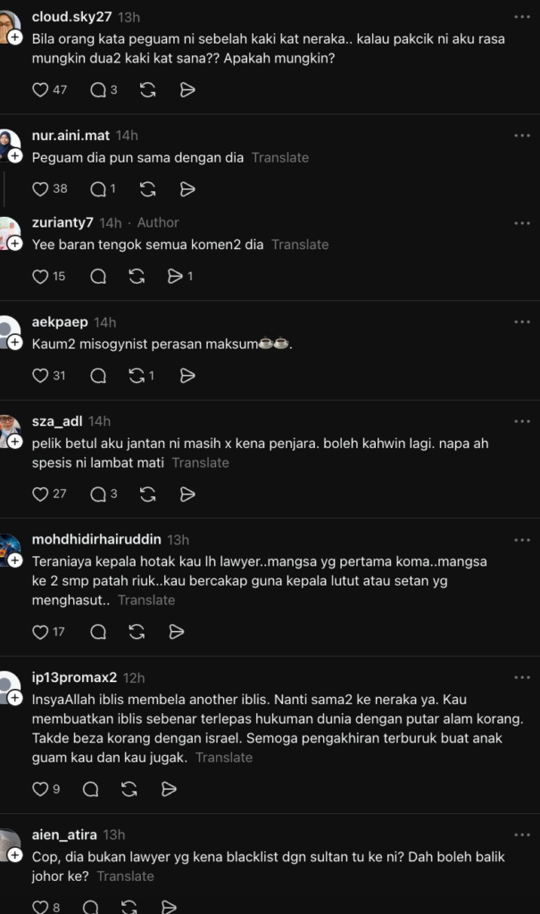 Namun, kenyataan tersebut mengundang pelbagai reaksi netizen yang mempertikaikan tindakan serta pendirian peguam berkenaan, lebih-lebih lagi apabila kes tersebut melibatkan dakwaan serius berkaitan keganasan terhadap pasangan.