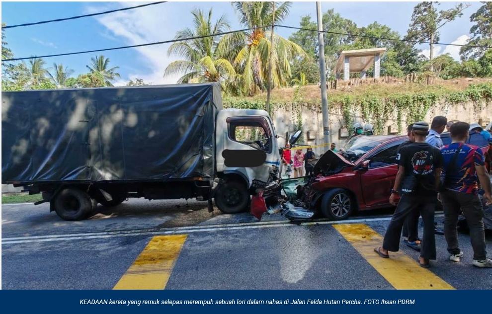 Nahas pertama berlaku kira-kira jam 3.40 petang mengorbankan tiga nyawa termasuk pelajar kolej apabila kereta dinaiki mereka bertembung dengan sebuah lori di Jalan Felda Hutan Percha.